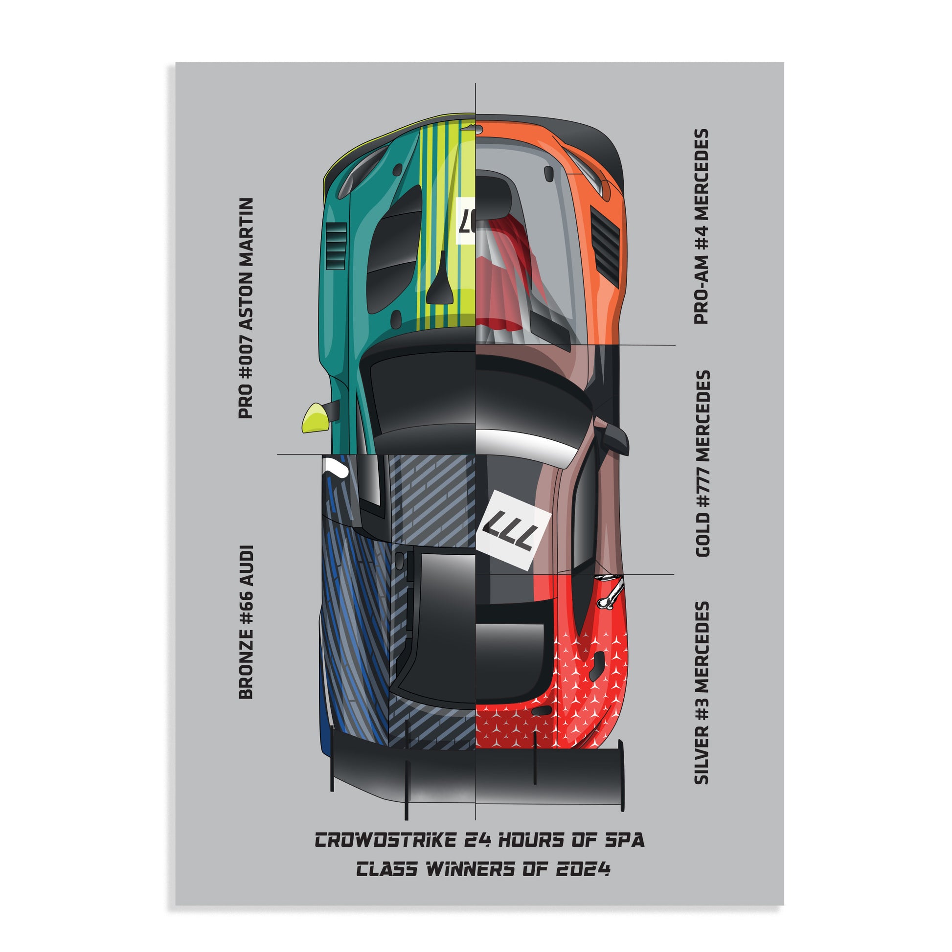 2024 Class winners poster featuring sections of the 2024 class winners to make one GT3 car